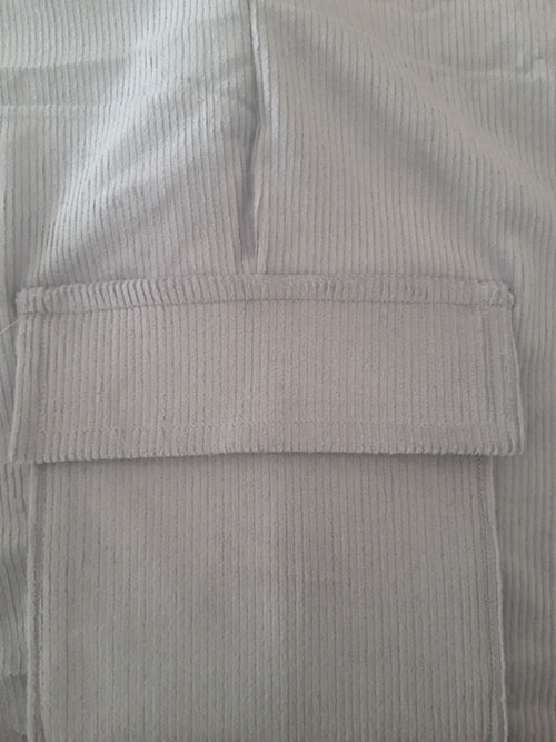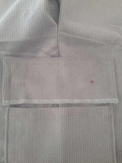 Nun stecke ich die Taschenbeutel rechts auf rechts an das erste Hosenteil, natürlich an die Seitennaht. Achte dabei darauf, dass die Knipse aufeinander liegen. Nähe nun den Beutel bei 1 cm fest. Bügle die Naht auseinander. Wiederhole diesen Vorgang nun an den anderen drei Teilen.