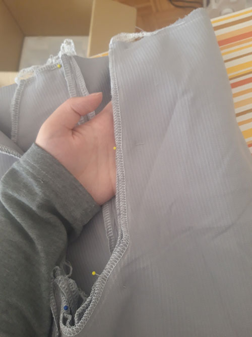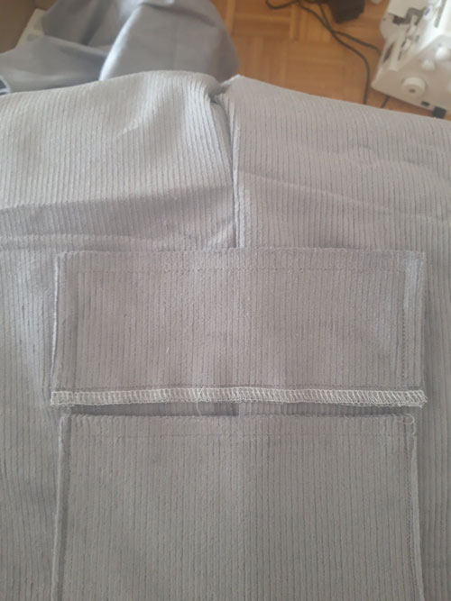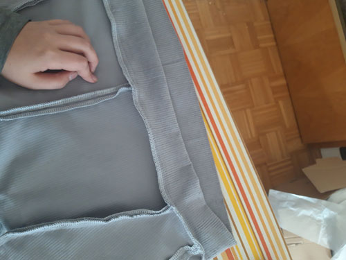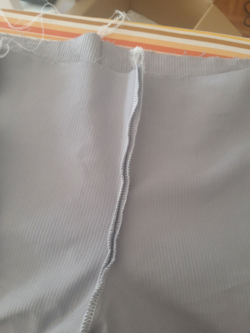 Bevor wir loslegen, versäubere ich die Taschenbeutel, die Seitennaht, Schrittnaht und die Innennaht.