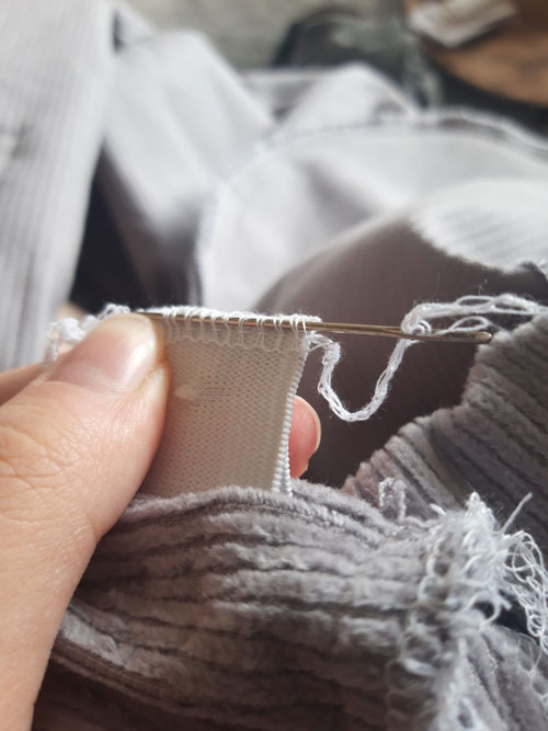 Versäubere die Naht. Ziehe durch das entstandene Loch den Gummi, versäubere ihn und vernähe den Zopf. Zum Schluss schließt du das Loch mit einem Handstich.