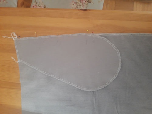 Nun machen wir das Gleiche mit dem Gummi an den Knöcheln. Die genaue Anleitung mit Bildern findest du in Schritt 8, denn es ist genau die gleiche Vorgehensweise. Messe an deinem Knöchel die Gummilänge ab. Markiere dir die Bündchenmitte und nähe bis zu ihr.