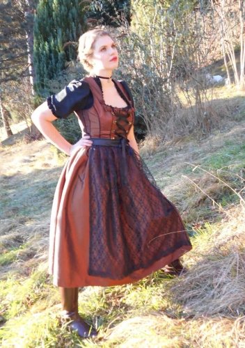 Frau in selbstgenähtem Dirndl aus Trachtenstoff und Spitze