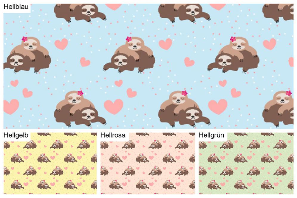 Herzallerliebst ist dieser kuschelige Fleece mit bezauberndem Faultier-Motiv. Innig liegt das Faultier-Pärchen zwischen rosaroten Herzchen beisammen. Der Hintergrund in Pastell-Tönen rundet die romantische Kulisse perfekt ab.