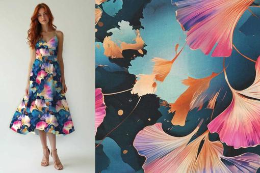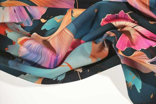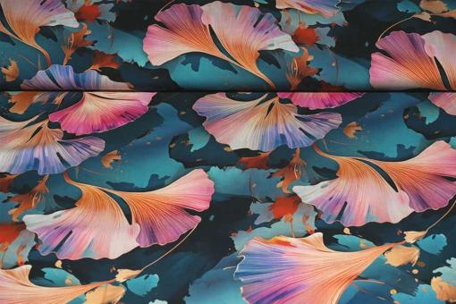 Dieser Stoff kombiniert florale Elemente mit einer modernen Farbpalette. Das Design aus Ginkgo-Blumen bringt einen frischen, natürlichen Touch in Ihre Projekte. Die sanften Farben Rosa und Lila kontrastieren mit einem kühlen blauen Hintergrund, was dem Stoff eine harmonische und zugleich lebendige Ausstrahlung verleiht.Der Stoff besteht zu 100 % aus Viskose, einem leichten, atmungsaktiven Material, das sich angenehm auf der Haut anfühlt. Viskose eignet sich hervorragend für luftige und fließende Kleidung, die gleichzeitig bequem und strapazierfähig ist.