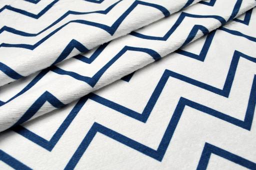 Das Zickzack-Muster auf weißem Frottee-Fleece erinnert an Wellen und verleiht dem Stoff so seine maritime Optik.Auf der einen Seite ein flauschig weicher Fleece Stoff mit Motiv, auf der anderen Seite ein saugfähiger Frottee-Stoff. Dieser Frottee-Fleece-Stoff ist super weich und damit extrem kuschelig. Perfekt für Bademäntel, Freizeit- und Sportbekleidung, Kuschel-Decken und -Kissen und vieles andere mehr.