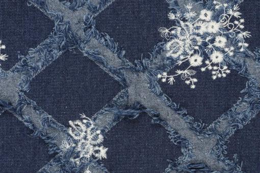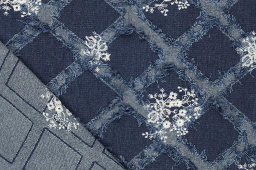 Trendiger, schwerer Denim mit Stickerei-Mix aus Rauten und Blumen - eine optische Wucht!