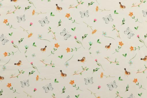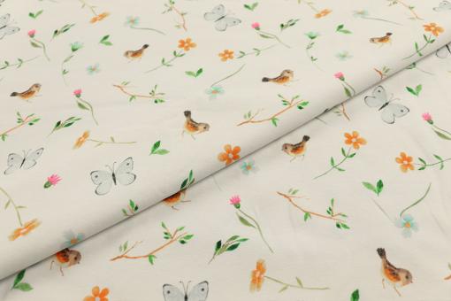 Romantischer Baumwolljersey in Weiß mit zartem Print aus Blumen, Vögeln und Schmetterlingen.