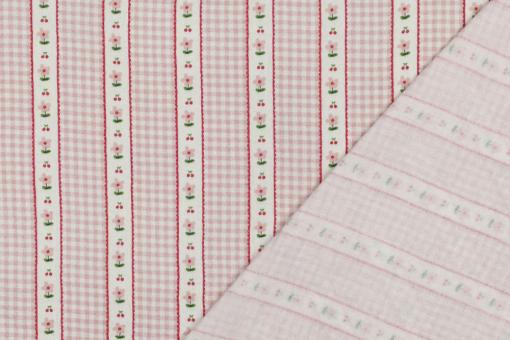 Dieser liebevoll gestaltete Stoff kombiniert zartes Vichy-Karo mit feinen Streifen aus kleinen Blüten und süßen Kirschen. Die harmonischen Rosa- und Rottöne verleihen dem Design eine romantische, leicht verspielte Ausstrahlung.