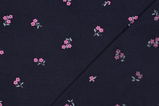 Dieser Stoff überzeugt mit einem tiefen dunkelblauen Hintergrund und feinen, gestickten kleinen Blüten. Die zarten rosa Blumen setzen einen schönen Kontrast und verleihen dem Stoff eine elegante und zugleich romantische Ausstrahlung.