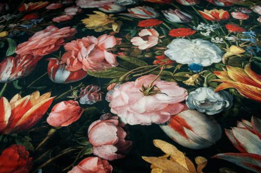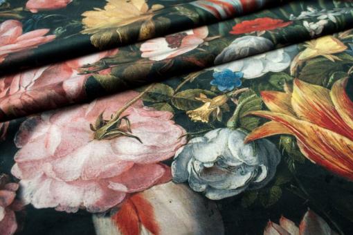 Das gemalte Blumenmotiv stammt aus dem 17. Jahrhundert - es ist im Original in Amsterdam im Kunstmuseum ausgestellt, und diente hier als Vorlage für das tolle Design. Die Rückseite des Stoffes ist weiß.