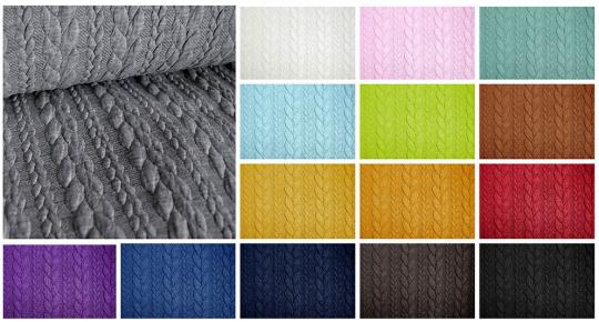Dieser modische, schwere Sweat ist ein absolutes Winter-Highlight! Er ist dreilagig gearbeitet, hat einen Viskose-Anteil und ist durch das eingearbeitete Zopfmuster zugleich Eyecatcher und gemütlicher Stimmungsverbreiter.Der Sweatstoff hält an kühleren Tagen angenehm warm. Durch den Elasthan-Anteil ist er leicht elastisch und sorgt damit für einen hohen Tragekomfort. Nähen Sie daraus schicke Westen, Cardigans oder Hoodies, gemütliche Overalls für Kinder oder andere bequeme Freizeit-Bekleidung. Auch Accessoires und Heimtextilien, wie Wickelauflagen, Krabbeldecken, Tages- oder Picknickdecken, werden damit zum absoluten Hingucker.