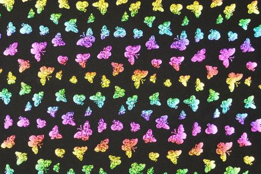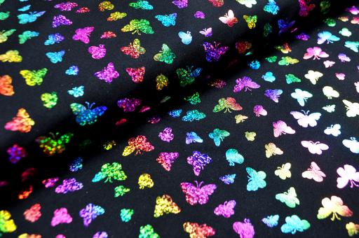 Stretchiger Folienjersey mit knallbunten Schmetterlingen - ein Eye-Catcher für Kostüme, Tanzsport und vieles mehr!