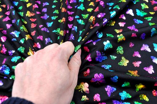 sehr elastische Stoff mit aufgebrachten Regenbogenschmetterlingen, die je nach Lichteinfall wunderbar glänzen, ist ideal