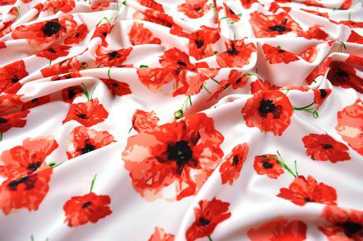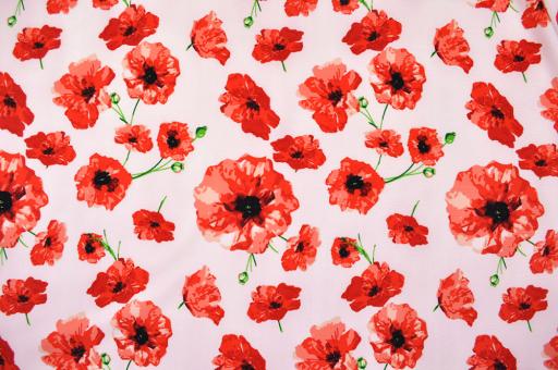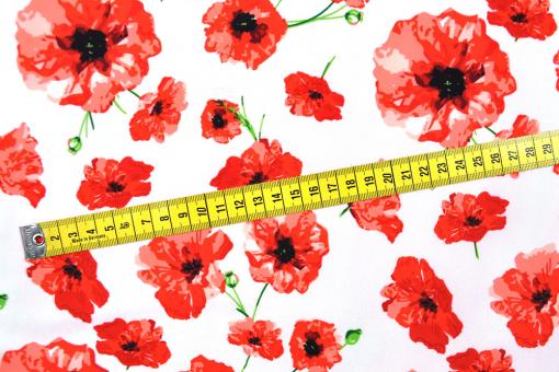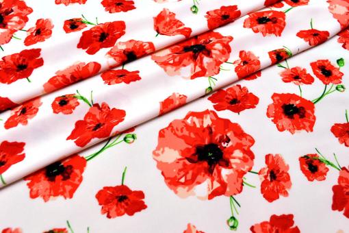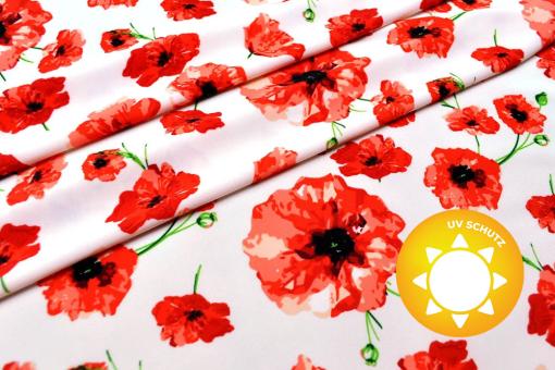 Die hochwertige Ware überzeugt nicht nur durch das tolle Mohnblumen-Design. Durch den hohen Elasthan-Anteil macht sie jede Bewegung mit und ist somit perfekt für eng anliegende Bekleidung geeignet, wie z. B. Bademode oder Sportbekleidung. Mit Tanz-Outfits, Gymnastikanzügen und Laufbekleidung aus diesem schnell trocknenden Material macht Sport doppelt Freude! Auch Kissenbezüge und Bespannungen sehen damit toll aus.Gr. Blüte: ca. 8 cm