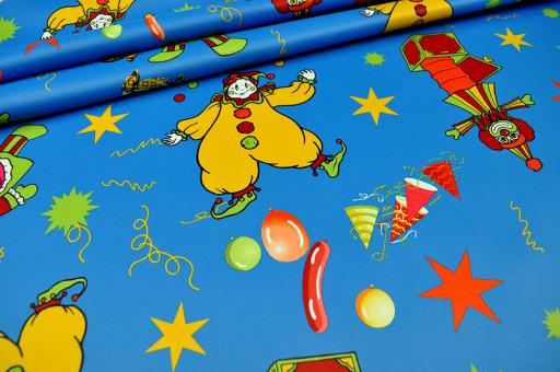 Manege frei - der perfekte Gardinen-Stoff für die Zimmer kleiner Zirkus-Fans!Ein schöner Blackout, bedruckt mit witzigen Clowns und Party-Utensilien. So ist das Nützliche ideal mit dem Schönen verbunden. Die pflegeleichte Ware ist ein spezieller Verdunklungsstoff - perfekt dafür geschaffen, erholsamen Schlaf in einem abgedunkelten Raum zu ermöglichen. Der Stoff ist lichtundurchlässig, fällt trotz der Schwere sehr schön und bringt damit das aufgedruckte Motiv toll zur Geltung.
