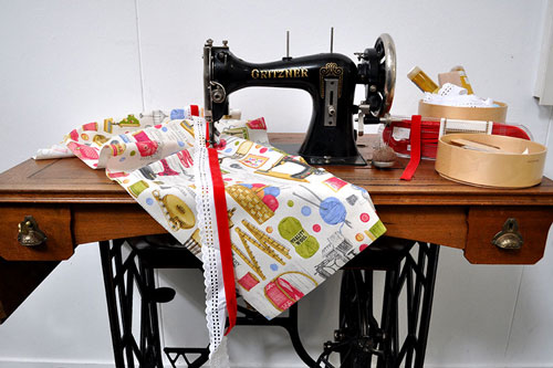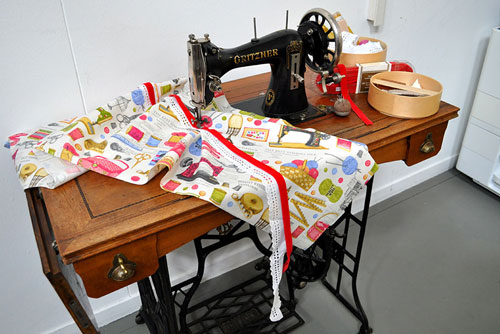 Wir lieben unsere alte Gritzner und dekorieren sie daher immer wieder liebevoll um. Dieses Mal ziert sie der Deko-Stoff Nähatelier mit vielen Motiven rund um das Thema Schneidern. Was könnte passender sein?