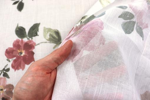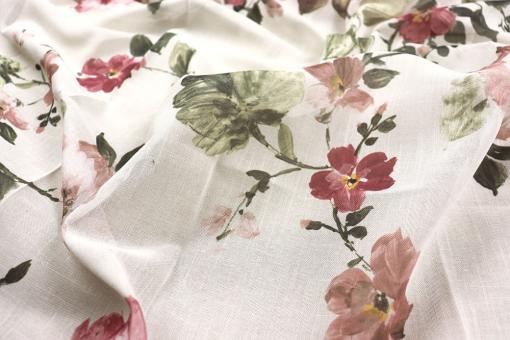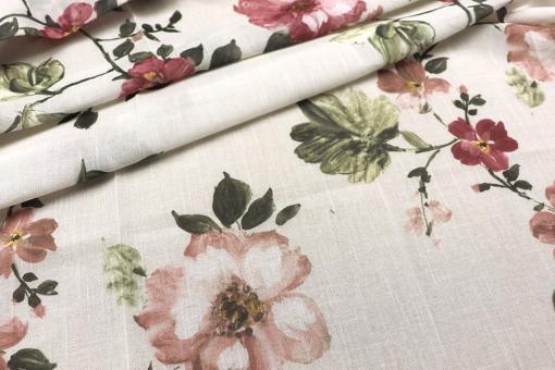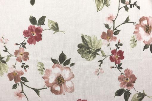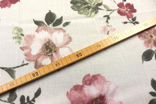 In Deutschland produzierter Stoff mit üppigem Rosenmotiv im Stil von Gardinenleinen