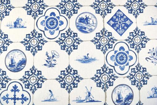 Wunderschöner Dekostoff im holländischen Stil! Er besteht aus pflegeleichtem Mischgewebe, ist dekorativ bedruckt und eignet sich für Heimtextilien aller Art. Egal ob als Übergardinen, Tischwäsche, Kissen oder Bettüberwürfe, als Raumteiler, usw. - dieser Stoff bringt Atmosphäre in die Räume. Die Ware ist bedingt blickdicht und matt, mit einem natürlichen Warengriff.Kachel: ca. 12 cm