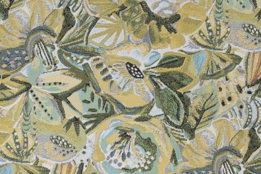 Farbenfroh und voller Leben: Die abstrahierten Blüten und Blätter in Gelb, Grün und Türkis verleihen diesem Stoff eine strahlende, natürliche Leichtigkeit. Das Design ist verspielt, ohne laut zu wirken – ideal für kreative Wohn- und Gartenideen mit tropischem Charakter.