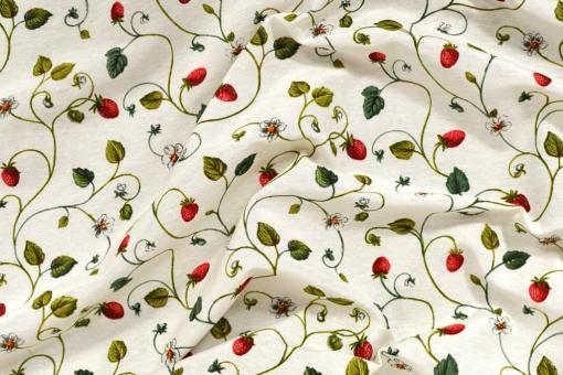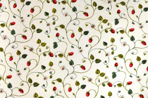 Schöner Dekostoff in Ripsbindung mit weichem Fall. Der Stoff ist im Landhausstil mit leckeren Erdbeeranken bedruckt und eignet sich für Vorhangschals genauso wie für leichte Übergardinen. Der Mix aus Blüten, Ranken und Früchten macht ihn besonders lieblich und macht Lust zum Anbeißen.
