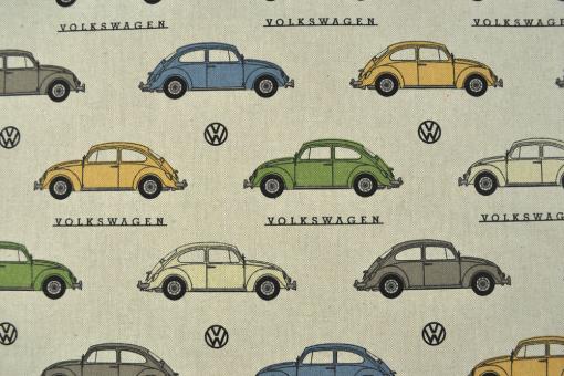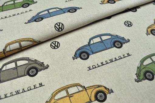 Rustikaler Dekostoff bedruckt mit farbenfrohen Autos im Retro-Style.Diese Meterware überzeugt nicht nur durch sein wunderschönes Motiv, sondern auch durch die rustikale Leinenoptik und die leicht strukturierte Oberfläche. Durch den hohen Baumwollanteil hat der Stoff einen weichen und hautsympathischen Warengriff. Das Material der Wahl für Innen-Deko aller Art, wie Kissen, Tischdecken, Vorhänge, Accessoires und vieles mehr! Der Stoff hat einen Scheuerfestigkeit von 18.000 Martindale. Das heißt er eignet sich auch super für leichte Polsterarbeiten.