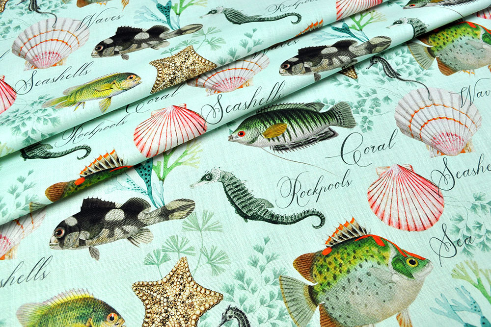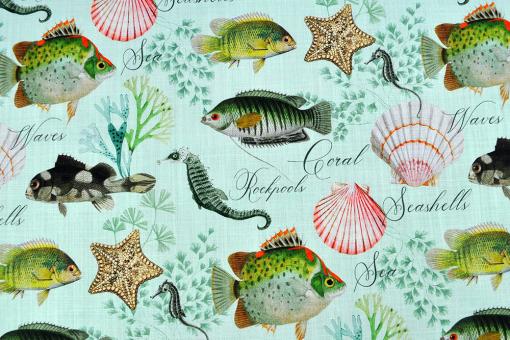 Muschel, Seepferdchen, Fisch & Co sorgen auf dieser Ware aus 100% Baumwolle für maritime Stimmung!