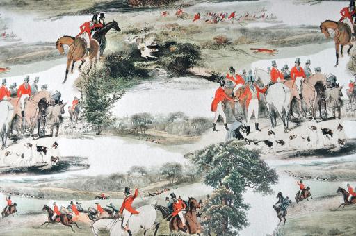 Sehr hochwertiger Dekostoff aus reiner Baumwolle mit Vinatge-Reitern bei der Jagdsaison