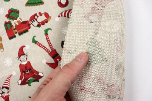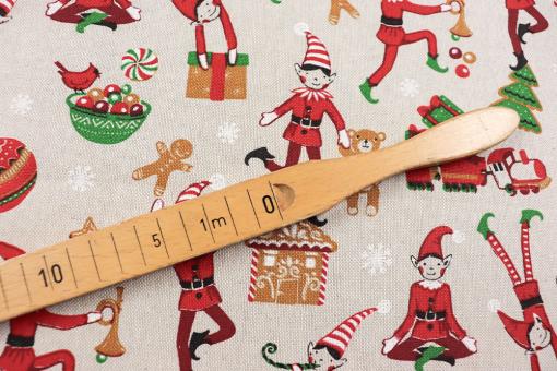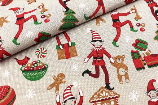 Ein Stoff wie aus der Weihnachtswerkstatt: Wichtel, bunte Spielzeuge und jede Menge gute Laune – auf natürlichem Leinenlook!