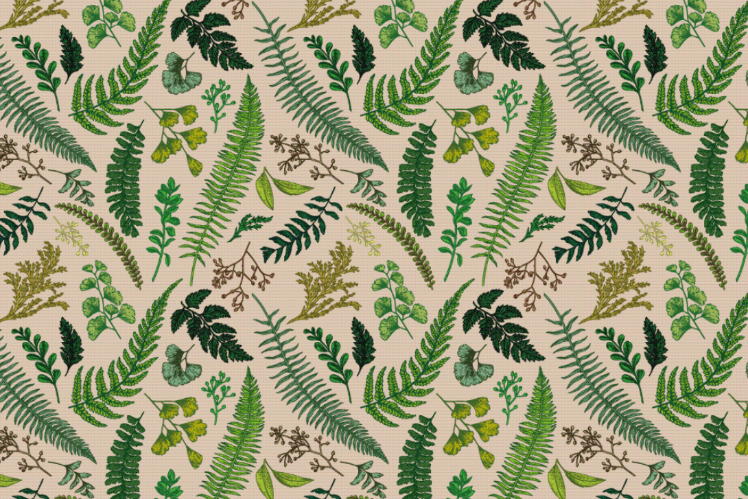 der feinen Illustration verschiedenster Farne und Gräser, ist dieser