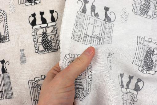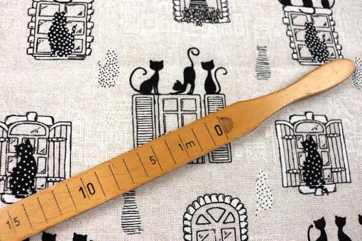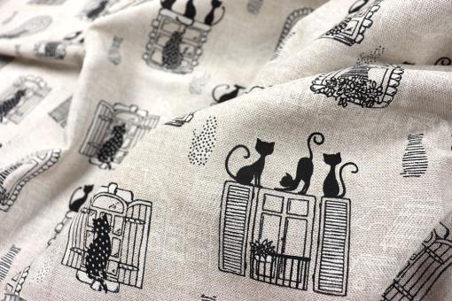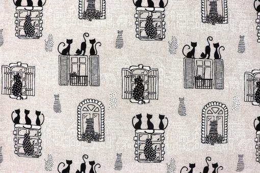 Der stimmungsvolle Dekostoff aus pflegeleichtem Mischgewebe ist dekorativ mit Katzen und Fenstern versehen und eignet sich für Heimtextilien aller Art. Egal, ob als Übergardinen, Tischwäsche, Kissen oder Bettüberwürfe, als Raumteiler, usw. - dieser Stoff bringt Atmosphäre in die Räume. Die Ware ist bedingt blickdicht und matt, mit einem natürlichen Warengriff.Breitenrapport: ca. 21 cm