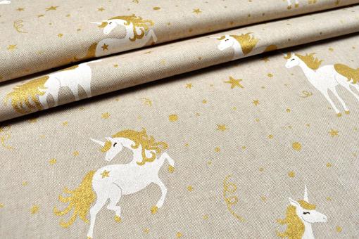 Dieser märchenhafte Deko-Stoff in toller Leinen-Optik lädt zum Träumen ein. Verschiedene Einhörner in Kombination mit unterschiedlichen Glitzer-Elementen zieren diesen Stoff. Der hohe Anteil an Baumwolle sorgt für einen tollen und absolut weichen Warengriff. Das Gewebe eignet sich für einzigartige Innen-Dekorationen wie Kissen, Vorhänge oder aber auch auffallende Accessoires und vieles weitere mehr.