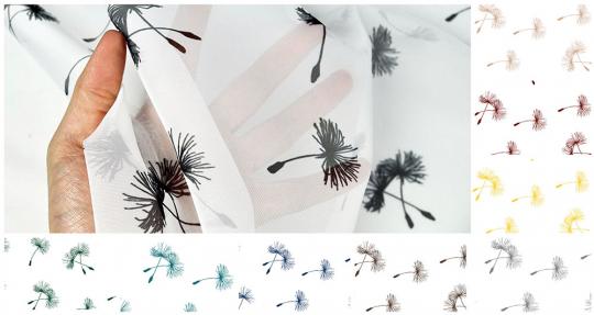 Voile ist ein klassischer transparenter Gardinenstoff. Das feine, geschmeidige Gewebe ist wie geschaffen für luftige Innen- und Fensterdekorationen. Der wunderschöne Pusteblumen-Print sorgt zudem für ein tolles Ambiente. So gelingen sehr schöne Gardinen/Vorhänge, Schals, Stores und viele andere Raumdekorationen. Der Stoff aus Polyester ist pflegeleicht und knitterarm.Samen: ca. 5 cm