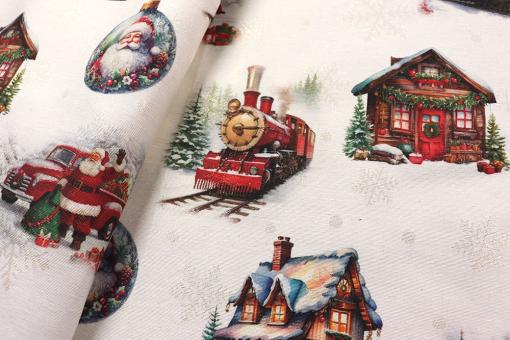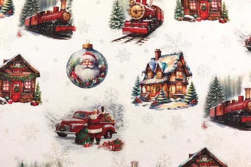 Weihnachten wie früher – dieser Dekostoff bringt pure Nostalgie mit sich! Dampfende rote Züge, liebevoll dekorierte Häuser, Christbaumkugeln mit Santa-Motiv und schneebedeckte Tannen sorgen für echte Festtagsstimmung. Feine Glitzereffekte setzen zusätzlich funkelnde Akzente und lassen den Stoff lebendig wirken.Das Material besteht aus einer hochwertigen Mischung aus Polyester, Baumwolle und Lurex. Die fein strukturierte Oberfläche ist angenehm weich im Griff und hat durch den Glitzer-Effekt eine festliche Ausstrahlung. Mit ca. 210 g/m² ist der Stoff ideal für vielfältige Dekoideen.