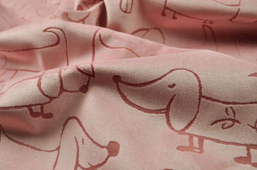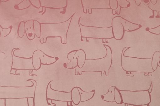 Der Stoff hat eine feine Samtoberfläche. Das Hundemotiv ist in Ausbrenner-Technik in den Stoff geäzt und so besonders gut zur Wirkung. Das Material ist leicht dehnbar st auf der Rückseite mit einem weißen Gittergewebe kaschiert, das für die Formbeständigkeit des Stoffes sorgt. Er ist blickdicht und matt, mit einem schönen Warengriff. Die Verarbeitung und Pflege ist einfach.