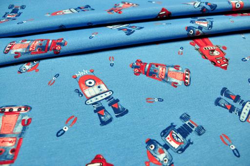 Kids und Roboter-Fans jeden Alters werden beim Anblick dieses Stoffes begeistert sein. Witzige Motive zieren die hochwertige Ware, die sich hervorragend für alle Arten von Innendekorationen eignet. Egal, ob als Tischwäsche, Übergardine, Kissen oder Bettüberwurf, als Raumteiler, usw. - dieses Material setzt Ihren Dekorationsideen keine Grenzen. Der Stoff ist bedingt blickdicht und matt, mit einem schönen Warengriff.In der Verarbeitung und Pflege ist dieser Dekostoff völlig unproblematisch. Sein Baumwollanteil sorgt für natürliche Optik, der Polyesteranteil macht ihn knitterarm und pflegeleicht.