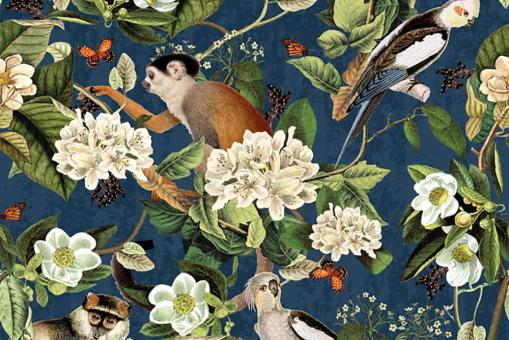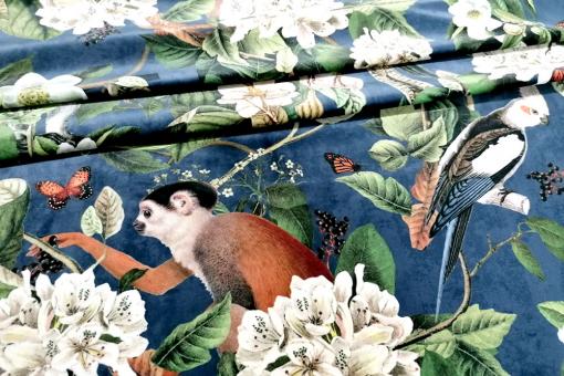 Da laust einen doch der Affe! Dieser farbenfrohe Samt überzeugt nicht nur mit einem verspielten Tier- und Pflanzenmotiv, sondern auch durch einen herrlichen Warengriff und eine 1A-Qualität.