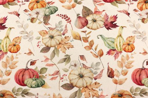 Herbst in seiner schönsten Form: Pumpkin Poetry bringt die ganze Vielfalt der goldenen Jahreszeit auf Stoff. Aquarellartige Kürbisse, bunte Blätter und sanfte Naturtöne schaffen ein harmonisches Gesamtbild, das sich perfekt für Tischläufer, Kissen, Vorhänge oder kreative Dekoideen eignet.