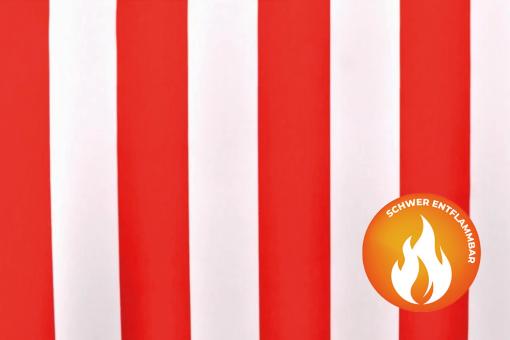 Leichter Baumwollstoff mit rot-weißen Streifen – dekorativ, leicht zu verarbeiten & schwer entflammbar (B1).