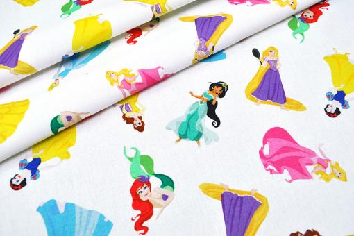 Dieser Stoff ist einfach ein Muss für kleine und große Prinzessinnen!Die Disney Prinzessinnen Arielle, Cinderella, Aurora, Schneewittchen, Belle, Jasmine und Rapunzel schmücken diese tolle Baumwoll-Popeline!
