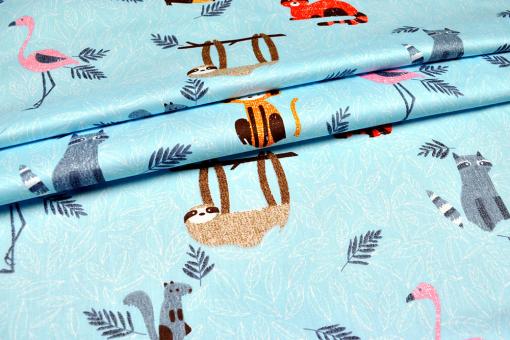 Jede Menge süße Tiere findet man auf diesem Stoff aus reiner Baumwolle. Er ist matt, bedingt blickdicht und hat einen sehr natürlichen, weichen Warengriff. Sorgen Sie für peppige Hingucker im Kinderzimmer und zaubern Sie mit dieser Ware hübsche Heimtextilien wie Kissen etc. Aber auch Bekleidung und Bastelarbeiten sehen mit diesem Gewebe einfach spitze aus.Faultier: ca. 7 cm breit