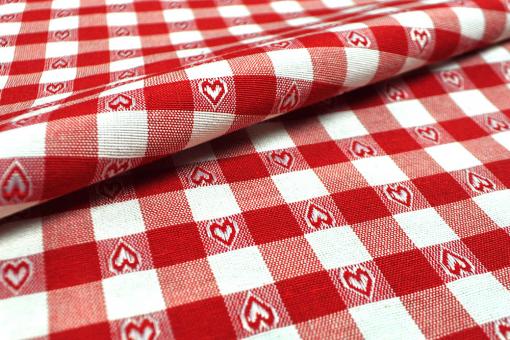 Schöner Dekostoff in Überbreite mit klassischem Vichy-Karo und niedlichen Herzen. Mit diesem Dessin liegen Sie immer richtig - ein Muster, das immer aktuell bleiben wird. Es passt zu vielen Stilrichtungen und verbreitet in den Räumen eine fröhliche Atmosphäre. Der perfekte Stoff für Heimtextilien aller Art: Übergardinen, Tischwäsche, Kissen, Hussen, Bettüberwürfe und vieles mehr sehen damit fantastisch aus. Natürlich auch ideal für jegliche Art von Dekorationen für Partys, Events etc. Der Stoff ist bedingt blickdicht und matt, mit einem natürlichen Warengriff. Das Mischgewebe ist pflegeleicht und einfach zu verarbeiten.Die Überbreite von 280 cm bietet viele Möglichkeiten der kreativen Raumgestaltung. Raumhohe Fensterdekorationen oder übergroße Tischdecken lassen sich ohne störende Zwischennähte anfertigen