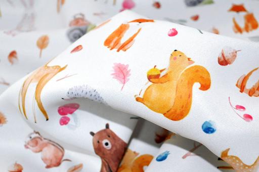 Dieser Stoff mit süßem Waldtiermotiv im Aquarellstil ist ein klassischer Verdunkelungsstoff. Er ist so verwoben, dass die schwarze Mittelschicht von der bunt bedruckten Ober- und der weißen Unterseite ummantelt ist und damit wenig bis kein Licht durchdringen lässt. Das bedruckte Gewebe ist auf der Rückseite weißgrau. Der ideale Stoff zum Verdunkeln von Räumen wie Schlafzimmer, Veranstaltungsräume, Kranken- und Pflegezimmer und vieles mehr.