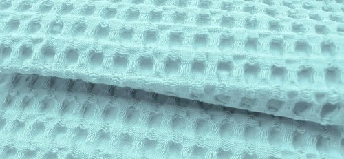 Bei dem sogenannten Waffelpiqué-Stoff aus Baumwolle handelt es sich um eine sehr spezielle Art von Frotteestoff. Die Oberfläche dieses Stoffs weist durch ein spezielles Webverfahren ein schachbrettartiges Muster auf. Kleine Kästchen aus gewebtem Stoff geben dieser Frottee-Art ihr besonderes Aussehen.