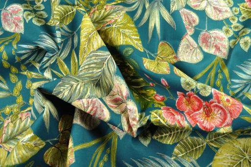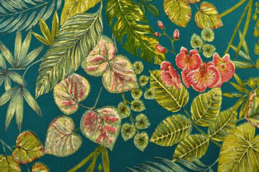 Kunterbunt und tropisch schön ist dieser lebhafte Markisenstoff mit einseitigem Dessin. Ihn
