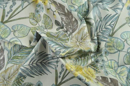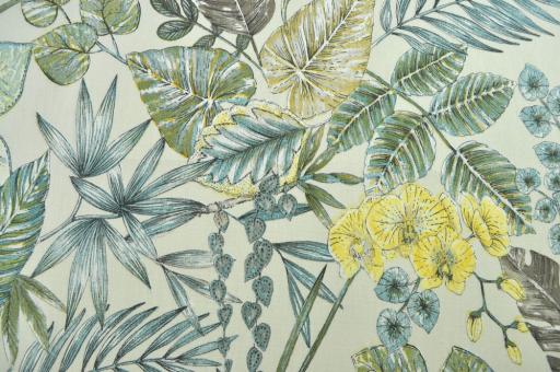 Kunterbunt und tropisch schön ist dieser lebhafte Markisenstoff mit einseitigem Dessin. Ihn