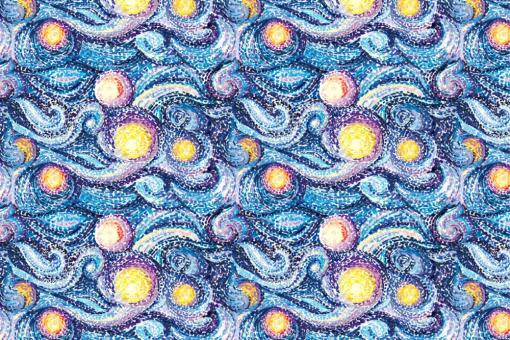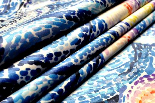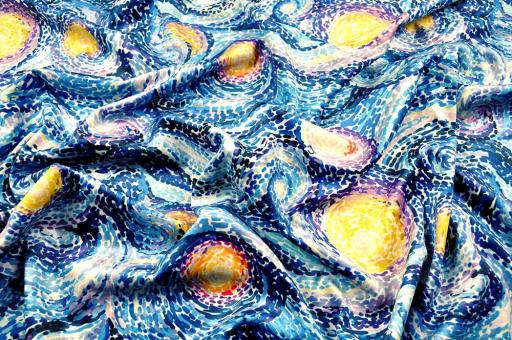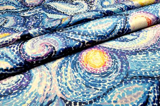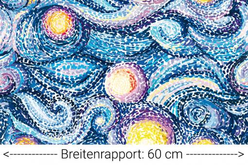 Super edle Meterware für echte Kunstliebhaber. Dieser sehr fest gewirkte Stoff hat eine seidig weiche Samtoberfläche mit elegantem Schimmer. Das in satten Farben bedruckte Gewirk ist auf der Rückseite cremefarben. Die Ware mit weichem Warengriff fällt geschmeidig und ist formstabil. Mit 80.000 Scheuertouren nach Martindale empfiehlt sich der Stoff besonders für alle Polsterarbeiten. Fantastisch sehen damit natürlich passende Kissen, Vorhänge, Überwürfe und Bespannungen aus. Auch lassen sich daraus außergewöhnliche Kleidungsstücke und Accessoires wie z. B. Taschen fertigen.Breitenrapport: ca. 60 cm