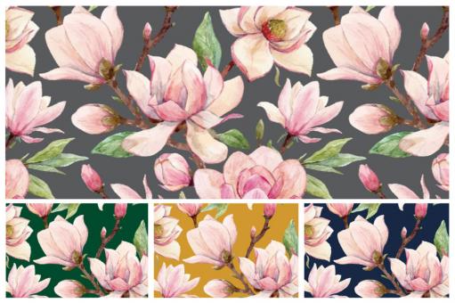 Hochwertiger Möbelstoff der Extraklasse mit wunderschönem Magnolien-Motiv. Dieser sehr fest gewirkte Stoff hat eine seidig weiche Samtoberfläche mit edlem Schimmer. Das bedruckte Gewirk ist auf der Rückseite cremefarben. Die Ware mit angenehm weichem Warengriff fällt geschmeidig und ist formstabil. Mit 80.000 Scheuertouren nach Martindale empfiehlt sich der Stoff besonders für alle Polsterarbeiten. Fantastisch sehen damit natürlich passende Kissen, Vorhänge, Überwürfe und Bespannungen aus. Auch lassen sich daraus außergewöhnliche Kleidungsstücke und Accessoires wie z. B. Taschen fertigen.Größte Magnolie: ca. 13 cm