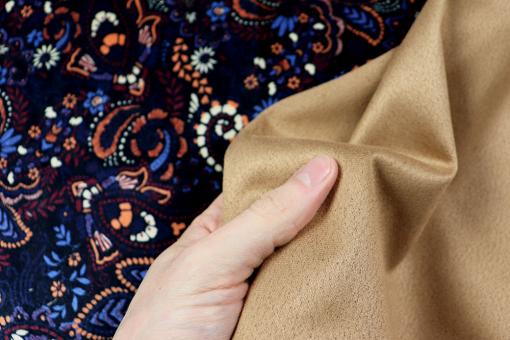 Herrlich bunt und floral präsentiert sich das opulente Motiv auf diesem schweren Samtstoff. Der leichte Schimmer des Materials verleiht den farbenfrohen Blumen eine einzigartige Optik.Wer dieses Material einmal in der Hand hat, will es nie wieder loslassen. Der weiche, anschmiegsame Griff und der fließende Fall sind die schönsten Eigenschaften dieses hochwertigen Materials. Die Ware ist auf der Rückseite mit einer braunen Fellabseite kaschiert.