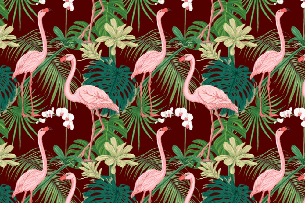 Samtstoff - Flamingos im Dschungel Bordeaux