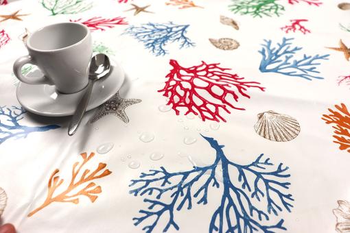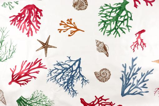 Entdecken Sie unseren hochwertigen Wachstuchstoff mit einem fröhlichen Korallen- und Muschel-Muster. Pflegeleicht und abwischbar – ideal für den Innen- und Außenbereich. Verleihen Sie Ihrem Tisch maritimen Charme und genießen Sie praktische Handhabung in jeder Situation. Perfekt als stilvolle Tischdecke! Jetzt im Shop erhältlich!