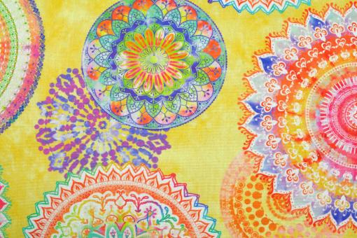 Dieses orientalische Motiv mit bunten Mandalas bringt jede Menge gute Laune mit sich! Der Stoff bringt mit seinen Vorteilen alle Anforderungen mit sich, die an einen Outdoor-Stoff gestellt werden. Er besteht aus Dralon - einem Acrylmaterial mit Teflon-Beschichtung. So ist die hochwertige Meterware fleckabweisend und strapazierfähig. Zudem werden Sie dank der hohen Lichtechtheit und der Abriebfestigkeit lange Freude daran haben. Perfekt für attraktive und edle Polsterungen für Sitzmöbel, die passenden Kissen sowie Bespannungen von Möbeln, Trennwänden, aber auch Tischdecken und vieles andere mehr. Der Stoff lässt sich sehr gut nähen, kleben und tackern. Der Digitaldruck sorgt für ein besonders klares Motiv und intensive Farben.Eigenschaften, die den Stoff für den Außenbereich empfehlen: